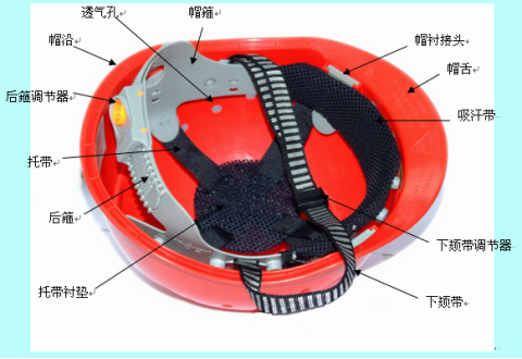 安全帽由帽殼、帽襯接頭、帽舌、吸汗帶、下頦帶調(diào)節(jié)器、下頦帶、托帶襯墊、后箍、托帶、后箍調(diào)節(jié)器、帽沿、透氣孔、帽箍組成。